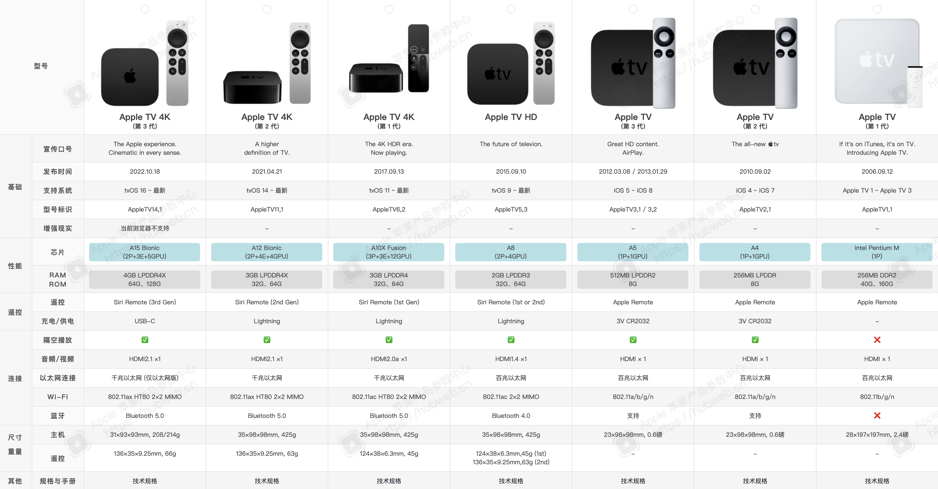 Apple TV历代详细参数详见上图, 或参考Apple官方页面