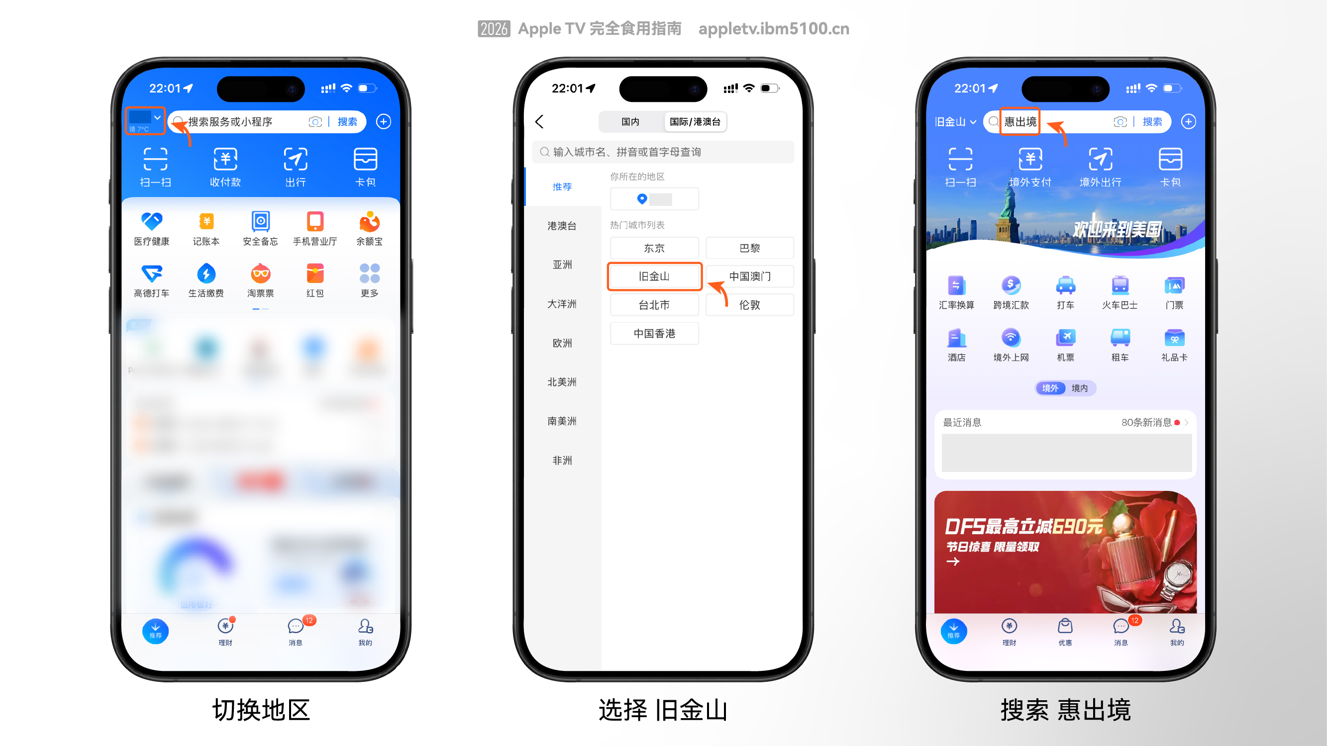 1.在支付宝左上角更改地区为“旧金山”。(这里也可以搜索任意美国的城市,或是手动切换)