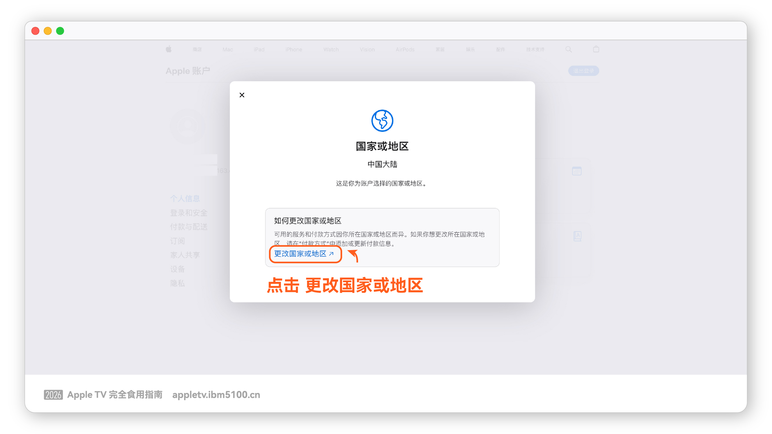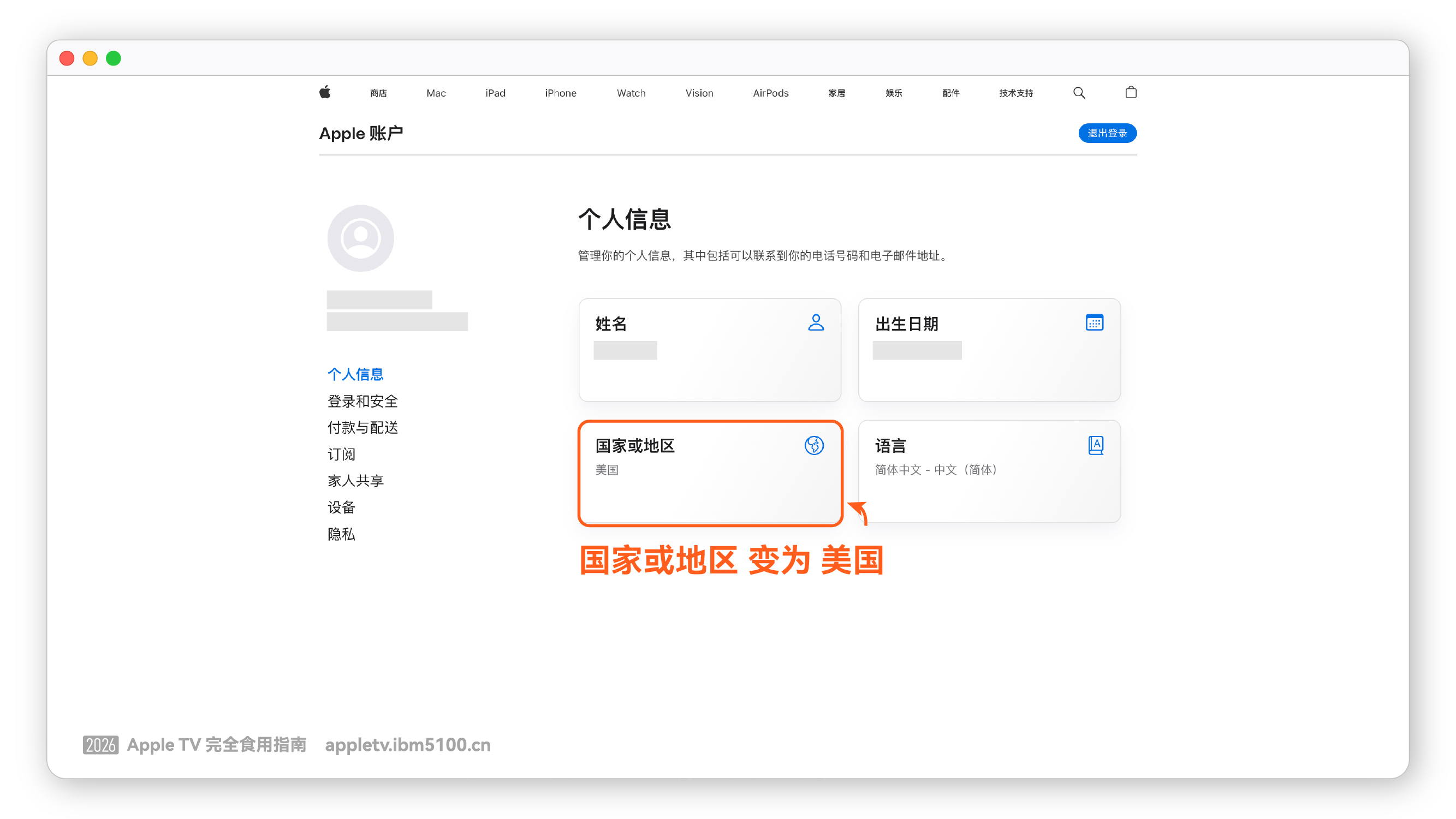 登陆国区Apple ID后,在 “个人设置” 里,点击 “国家或地区” 选择 “更改国家或地区”。
